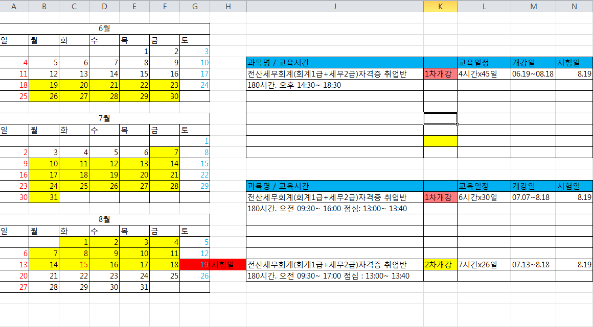 실업자 내일배움카드 6월,7월 시간표 입니다.